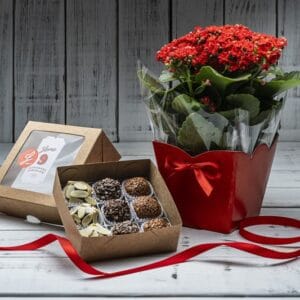 Nosso Buquê de Kalanchoe, uma flor conhecida por sua durabilidade e significado de afeto, acompanha uma charmosa Caixa com 9 Brigadeiros Gourmet Leme, produzidos artesanalmente com ingredientes selecionados.
